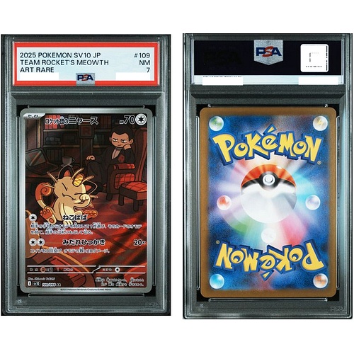 DescrizioneUna carta rara molto ricercata con un fascino nostalgico: il Team Rocket’s Meowth Art Rare proviene dal set giapponese SV10: The Glory of Team Rocket, un’espansione focalizzata sui Pokémon posseduti dal Team Rocket. Questa carta presenta una splendida Art Rare (AR), nota per il suo artwork unico e Full Art che cattura il famoso Pokémon in un’illustrazione dettagliata e a tema. L’oggetto è stato professionalmente autenticato e gradato da PSA (Professional Sports Authenticator) con il punteggio di PSA 7 (Near Mint).